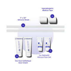 The Scar Heal Kit is here for you to make scar management as easy as possible. Use Scar Fx Silicone Sheeting at night or while you're sleep. Use RejuvaSil Silicone Scar Gel during the day or when you're most active.