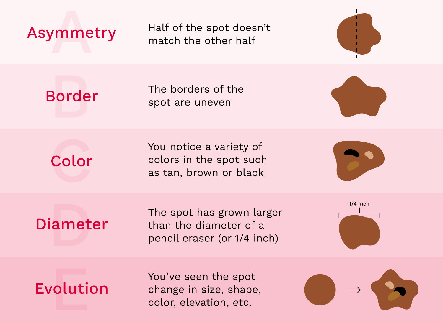 One of the most important things you can do to prevent late stage skin cancer is to catch it early— which means skin checks. These should be done once a year with your dermatologist, but also once a month on your own. Here’s a few things to be looking out for: