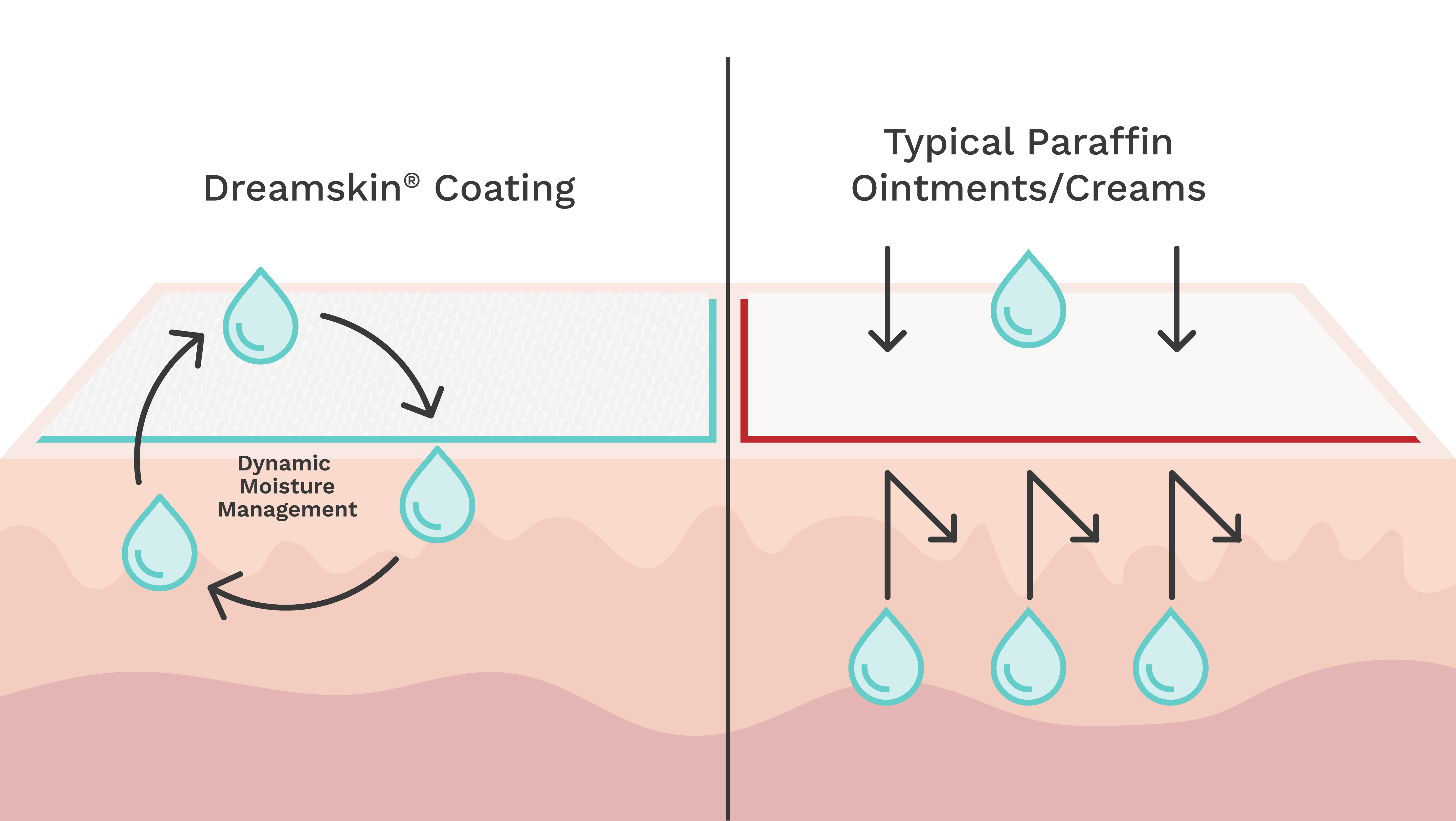 When the Dreamskin coating is in direct contact with damaged skin, it kick-starts the skin’s natural moisturizing mechanisms, regulating the skin’s temperature and rehydrating the skin to relieve the scratch/itch cycle associated with dry, sensitive or eczema prone skin.