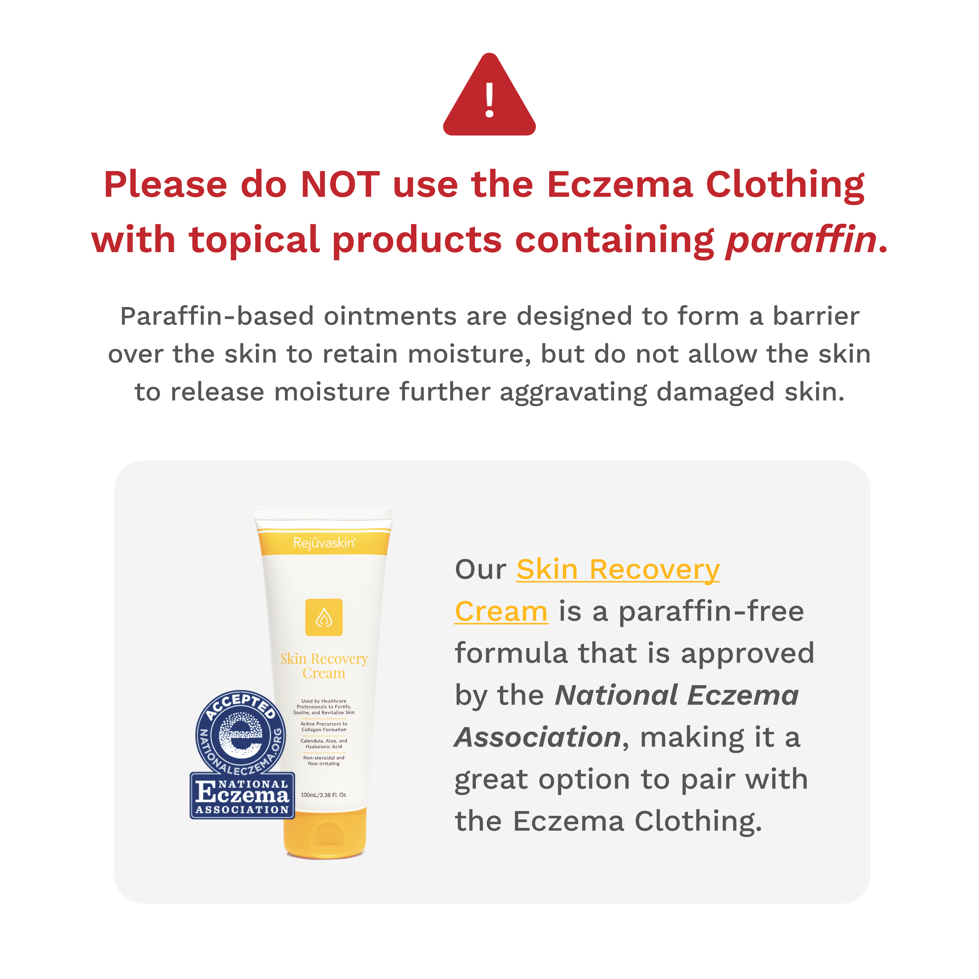 Skin Recovery Cream is an ideal companion for Dreamskin garments as it’s free of paraffins and other harsh chemicals that can worsen eczema. Its gentle, nourishing formula complements Dreamskin's moisture-regulating technology, helping to soothe and protect sensitive, eczema-prone skin while enhancing comfort and hydration.